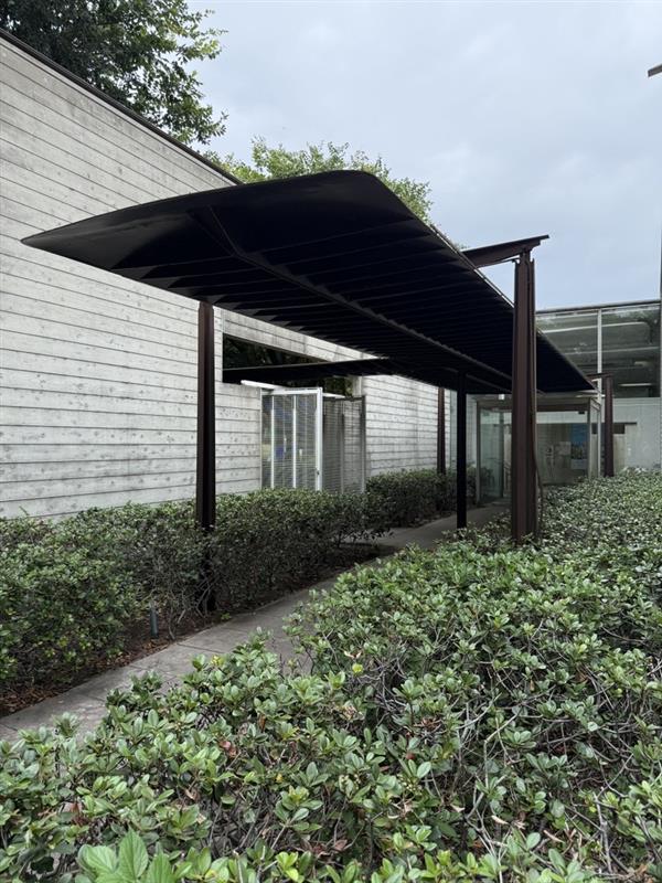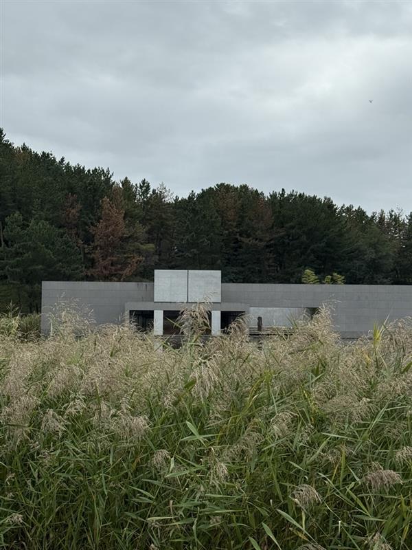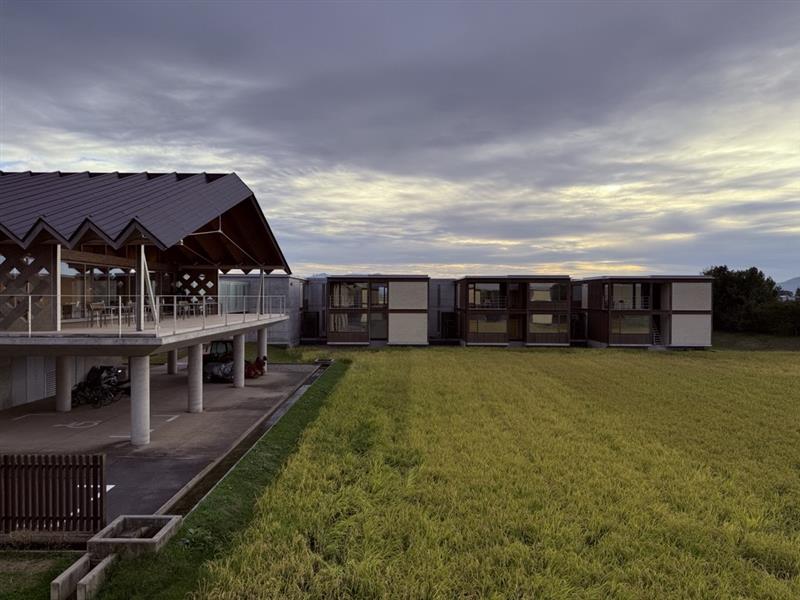 夜訪れると水田の中に照明により建築が水田に浮かび上がる。板状の折板屋根が梁も兼ね連続し、開口がなされた繋がりでリズミカルに配置され水平に拡がる水田に呼応する一方で幾何学的姿が美しさと固有の姿を創出されている。