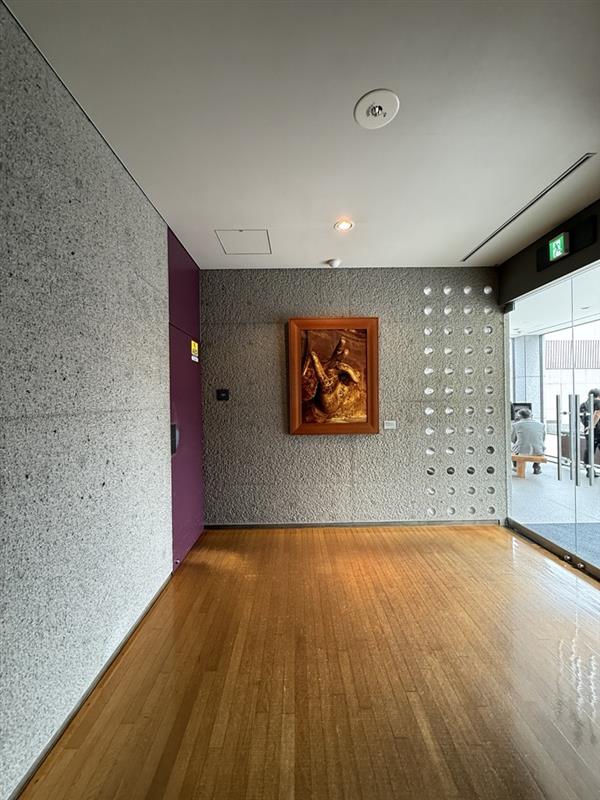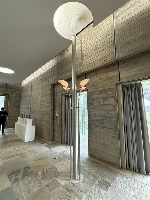レストランと展示空間とハンドル、ビシャン仕上のコンクリートの壁と丁寧で唯一の仕上の中を進むと、階段に導かれ広い展示空間が広がる。