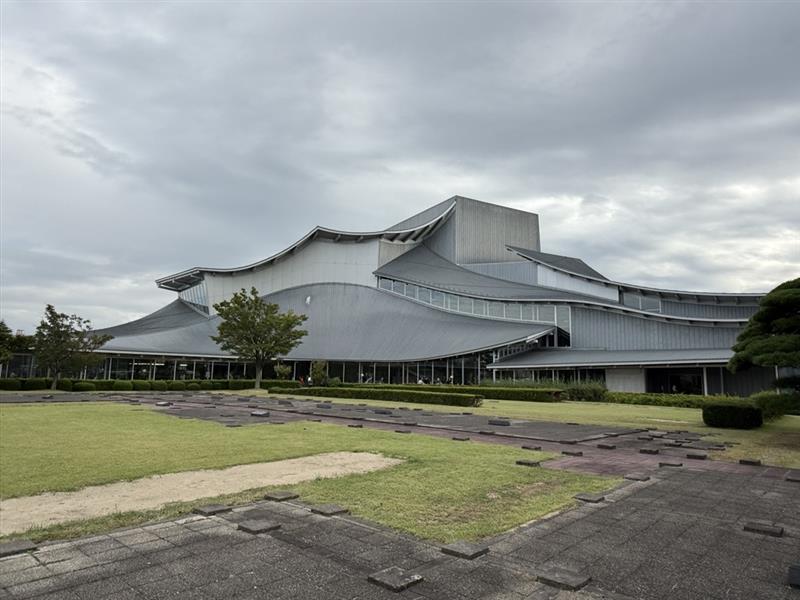 曲面屋根が不定形の矩形プランの四方から片流れで立ち上がり、高さのあるホールを包む丘のような城のような景観を創出。
