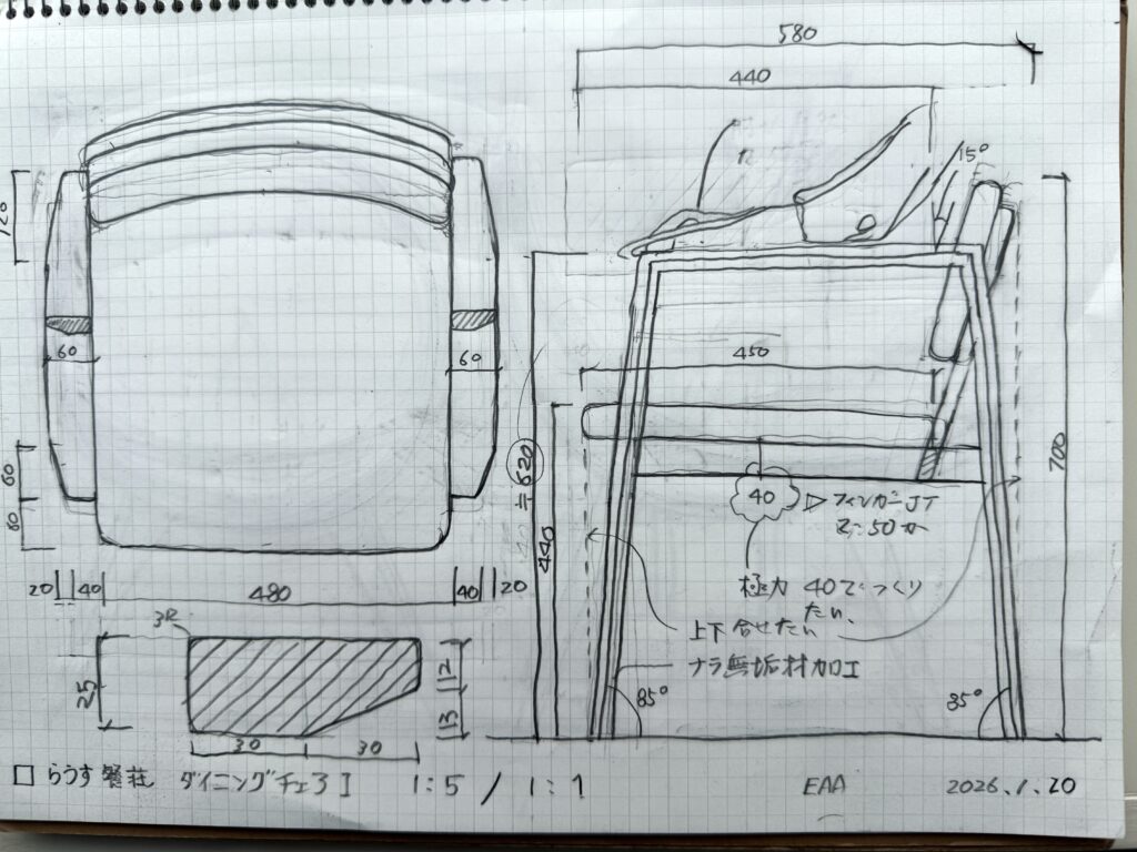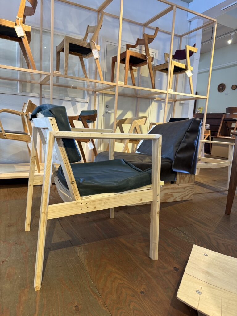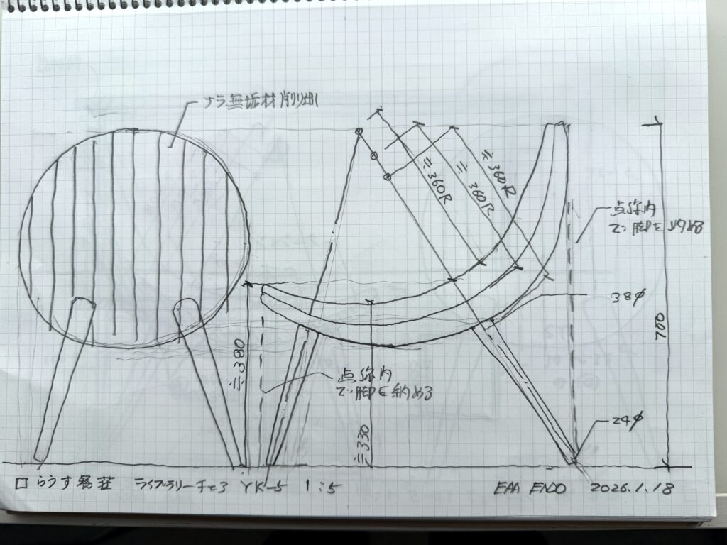 知床らうす餐荘(工事中)のダイニングチェア・ライブラリーチェアのデザインをEAAで行い、山上木工で試作検討を行っております。